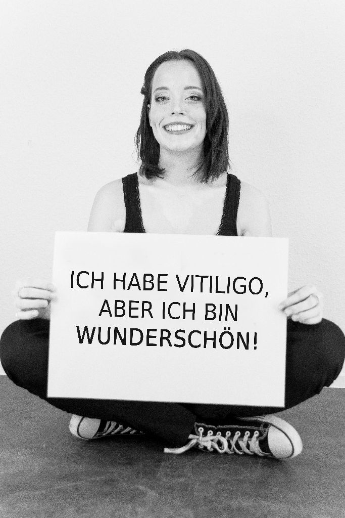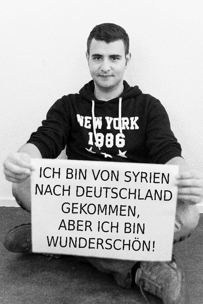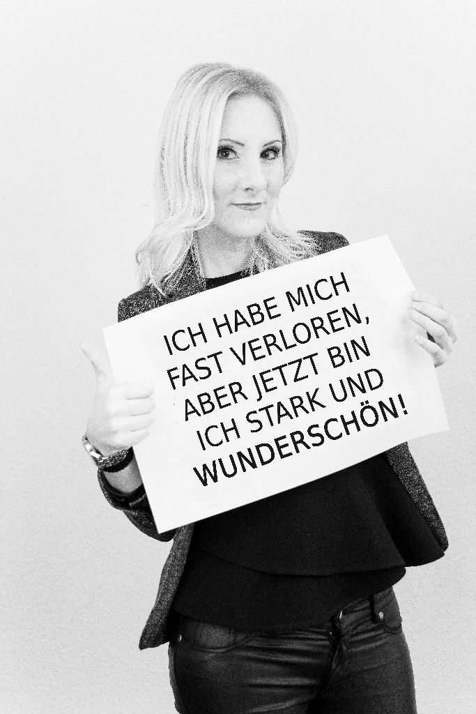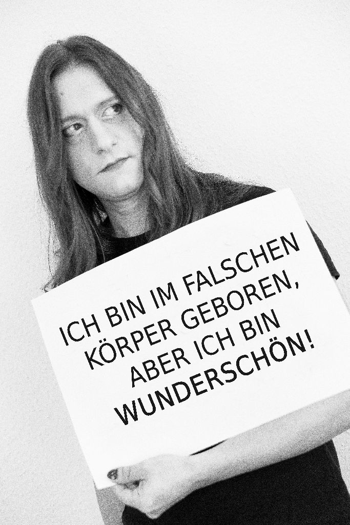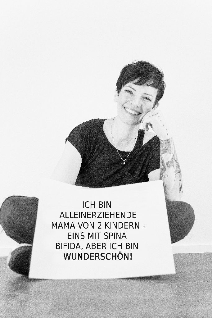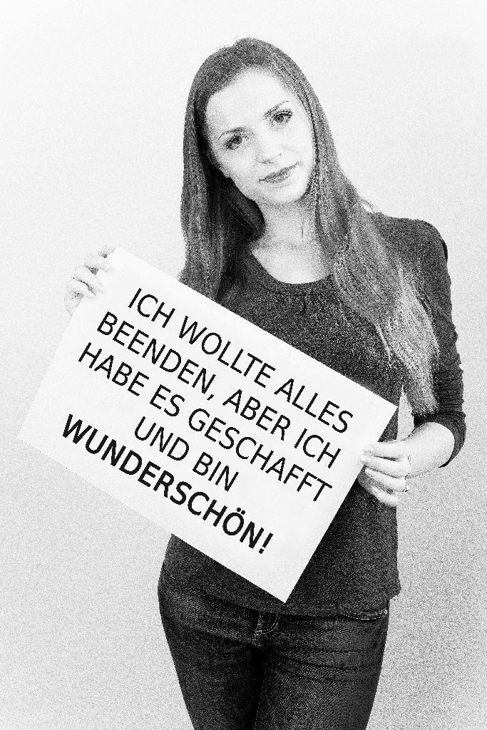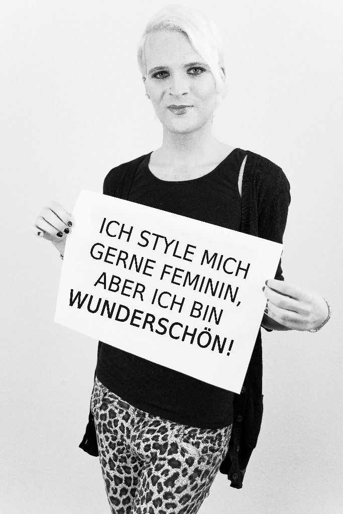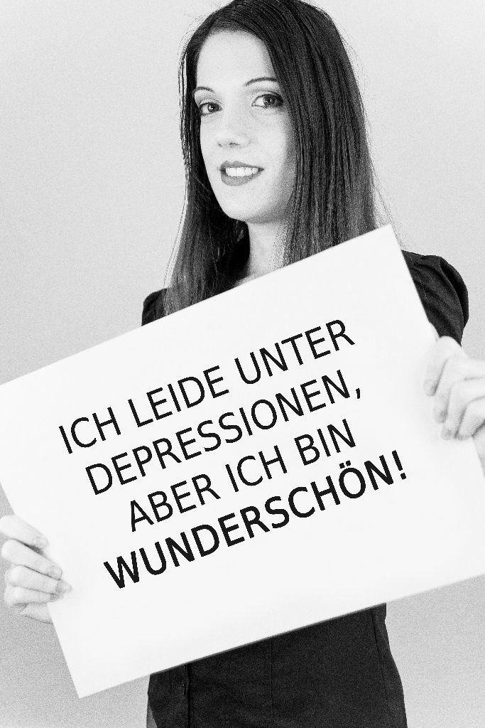 „Fotografiert wurden 13 Portraitaufnahmen in schwarz weiß, inklusive Make-up Artistin. Die Projektteilnehmer hielten auf der Aufnahme ein Plakat, mit ihrem persönlichen Statement in der Hand. D.h. sie wollen aufmerksam machen, was sie geprägt hat, z.B. Ich sitze im Rollstuhl, aber ich bin wunderschön.//Ich leide unter Depressionen, aber ich bin wunderschön.“