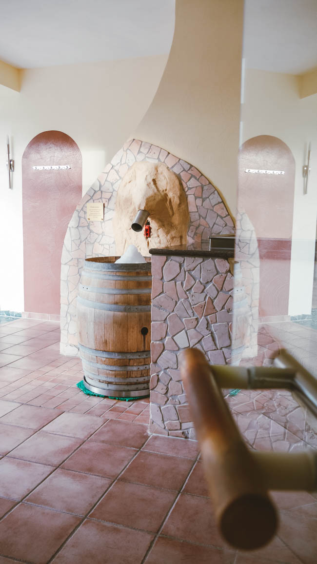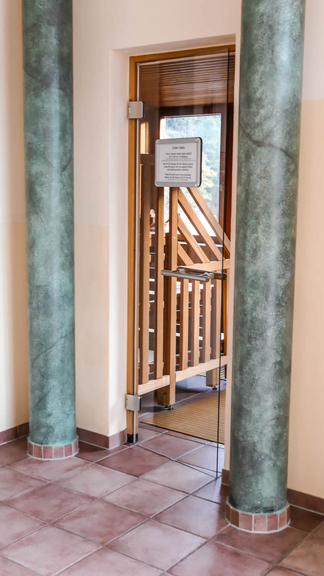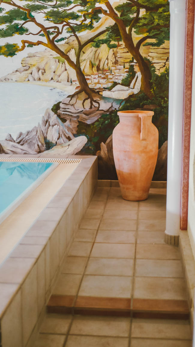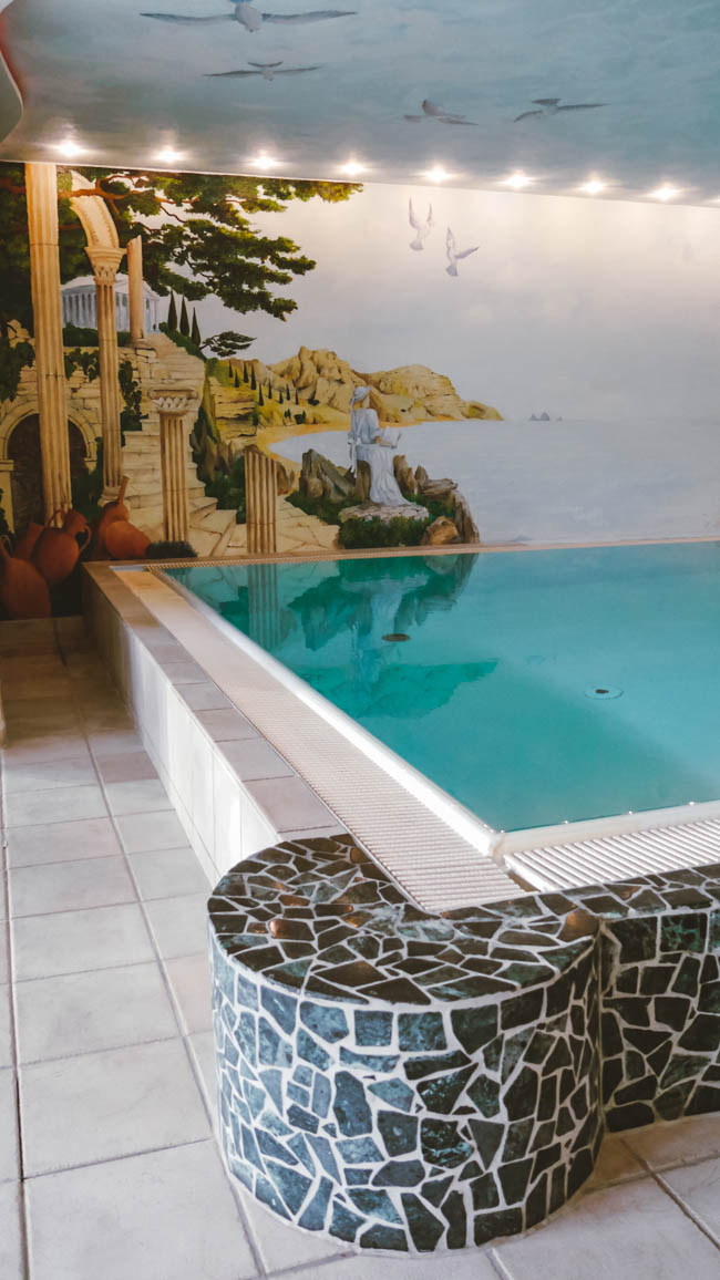Der Wellnessbereich erinnert im ersten Moment an ein Römerbad. Diesen Eindruck erhält man womöglich aufgrund der Wandmalerei im Bereich des Hallenbades. Ich liebe dieses Zeitalter und die damit verbunden Kunst. Das ist womöglich auf meine Schulzeit an einem katholischen Privatgymnasium zurückzuführen, in dem Latein bereits in der fünfte Klasse vor der englischen Sprache unterrichtet wurde. Das Schwimmbecken ist überschaubar in seiner Größe. Wer möchte kann aber durchaus seine Runden schwimmen. Ich bin meist direkt in den Saunabereich übergegangen und habe einen Platz im Ruhebereich eingenommen. Das war einfach mein Bedürfnis Nummer eins. Es gibt eine Infrarotkabine, ein Vitarium (50 – 60°C), ein Dampfbad und eine finnische Sauna (90°C). Letztere war uns die liebste. Mit 90°C kann nicht Jedermann umgehen, aber wir haben uns darin pudelwohl gefühlt. Ein Blick aus dem Fenster, vom eisig kalten Wind umher getriebene Blätter und wir entspannt auf der Holzbank am Schwitzen. Das war genial!